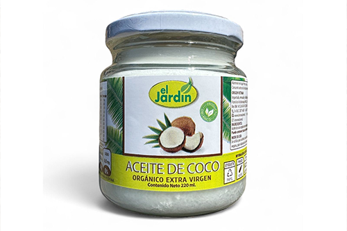 El aceite de coco El Jardín es un aceite de coco extra virgen, 100% puro y prensado en frío.