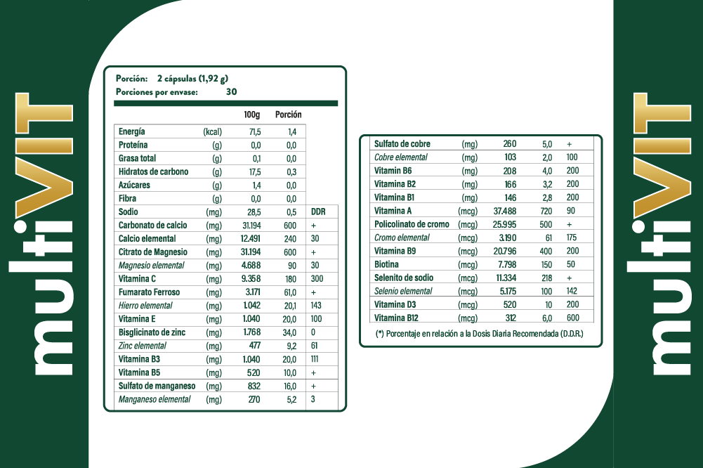 multiVIT es un suplemento nutricional que contiene una combinación de vitaminas y minerales esenciales. Fue diseñado en base a la DDR (dosis diaria recomendada), para complementar la dieta y así llegar a los requerimientos diarios. Apoyando las funciones normales del organismo y complementar la alimentación.
